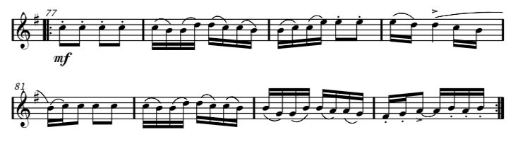 Now………. listen to it being played with the phrasing added – you can hear where the phrasing or musical ‘sentences’ occur by the louds and softs being played on the violin and also by the slight pauses or ‘breaths’ at the end of each musical sentence or phrase.