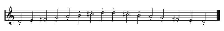 Staccato is an Italian term meaning ‘short and detached’. On a stringed instrument such as the violin, we play single bows very short and quick. We mark Staccato notes in music using a dot under or above the note. Here is D Major scale marked with Staccato on every note.