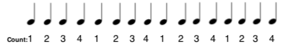 When you clap this pulse, the beats sound even and all exactly the same. However, the sideways arrow on the first beat of each bar (known as an accent) indicates that we would clap or play the first beat of every bar a little stronger. This emphasis gives music a rhythmic feel. If there were 3 beats in the bar, then the emphasis would be on every third beat. More on this later when we learn about Time Signatures.