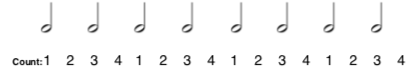 Here is what a rhythm with 3 beats in a bar looks like without barlines.