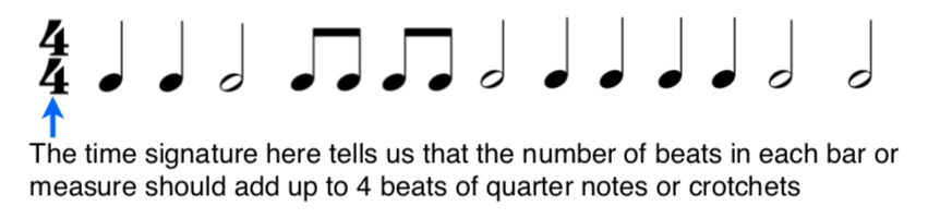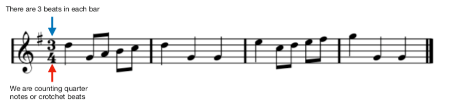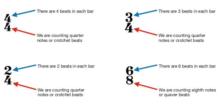 The above information helps us to understand how time signatures work. The top number tells us how many beats are in each bar. The bottom number tells us what sort of notes/beats we are counting.