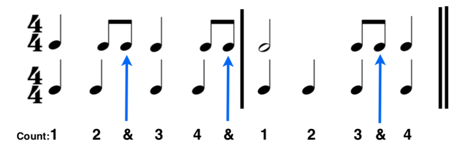 In the first bar, the quavers fall exactly on the metronome click. In the second bar, you can hear that the quavers fall just after the metronome click. This is because there is just half a beat of silence or rest ON the beat.