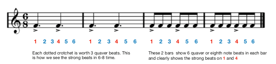 The 6-8 time signature has 6 quavers in each bar but what is important is that the beats are divided into 2 lots of 3 quavers. So the emphasis is on the FIRST quaver beat and the FOURTH quaver beat in each bar. The other name for 6-8 time is Compound Duple because it is divided into 2 x 3 quaver beats.