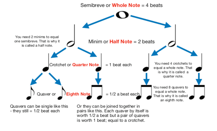 Time signatures simply tell us how many beats we need to count in each bar and what sort of notes/beats we are counting. It helps to have a look at the American note names. We use the term crotchet, quaver, minim etc but the American note names start with the semibreve as a “whole note”. See below.