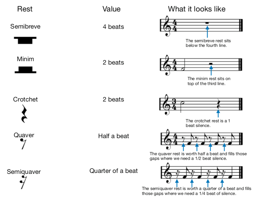 Rests show us where and for how long we have silence in music. Here is a list of the basic rests in music.