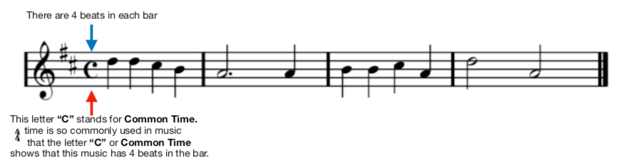 Here are the first 4 bars of Rigadoon by Henry Purcell. It is in 4-4 time. Listen to how the violin puts an emphasis on the first beat of each bar. Click on the play button below to listen.