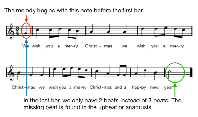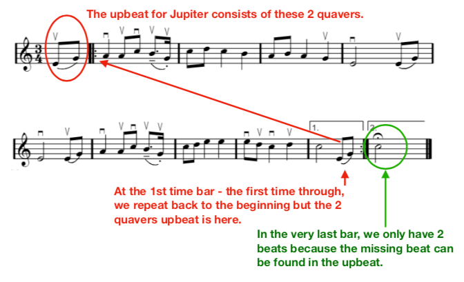 Some pieces of music start with an anacrusis or “upbeat”. This consists of a weaker beat before the first barline. This can be just a single crotchet such as we see in “Now Thank We All Our God” or it can be 2 or more quavers such as in “Jupiter from the Planets”.